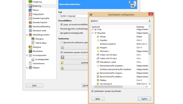 In GIMP zijn alle toetscombinaties te bekijken en ook handmatig aan te passen in het menu Sneltoetsen configureren, te vinden via Bewerken / Voorkeuren / Bediening / Sneltoetsen. Wil je alle Photoshop-sneltoetsen gebruiken en importeren? Surf dan naar deze website, download het bestand ps-menurc en hernoem het naar menurc. Plaats dit bestand vervolgens in de GIMP-installatiemap. Vrijwel alle sneltoetsen uit Photoshop zijn nu ook te gebruiken in GIMP!