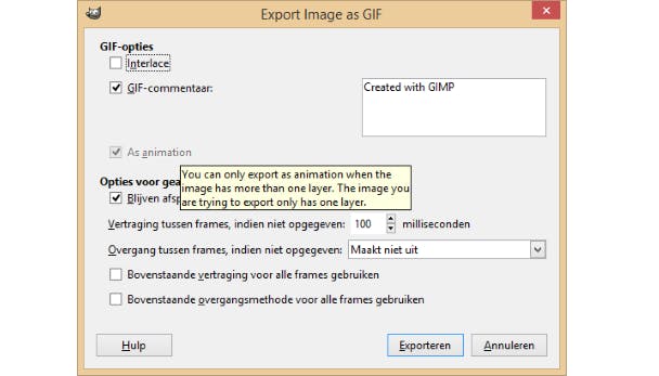 Boven de lagen staat Dekking 100,0. Klik in deze schuifbalk ergens halverwege, zodat de laag doorzichtig wordt en je ziet wat eronder zit. Zo zie je precies hoe de volgende animatie anders moet zijn ten opzichte van de vorige laag. Klaar? Klik dan op Bestand / Export as. Kies bij Selecteer bestandstype het type GIF-afbeelding. Klik op Exporteren. In het venster Export Image as GIF plaats je een vinkje naast As animation. De vertraging tussen frames staat standaard op 100 milliseconden, maar de animatiesnelheid kun je aanpassen door zelf het aantal milliseconden in te vullen. Kies vervolgens Exporteren en je GIF is klaar om bekeken te worden!
