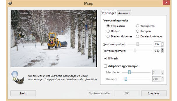 Filters maken het bewerken van foto's een stuk makkelijker. Ze geven het geselecteerde object of de hele foto een bepaalde look of vervorming. Het filter Warp, te vinden via Filters / Vervormingen / Warp, geeft je de mogelijkheid om bijvoorbeeld gezichten slanker te maken (zet de vervormingsstraal dan op ongeveer 100) of om het juiste perspectief te krijgen bij architectuurfoto's. Het is jammer dat er geen filtergallerij is, zoals in Photoshop, zodat je een overzicht hebt van wat alle filters doen. Je moet nu afgaan op de namen en met de filters spelen, om een idee te krijgen wat de effecten doen met jouw afbeelding.