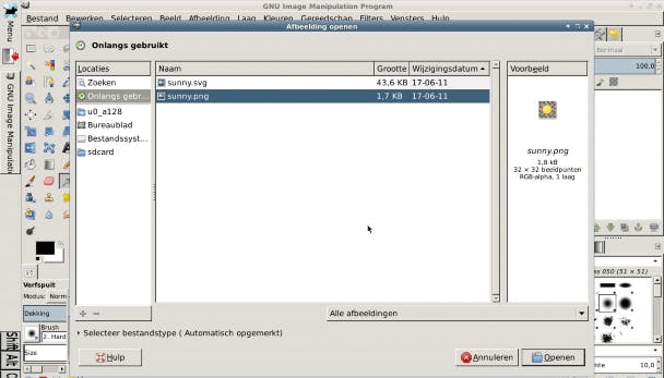 De installatie duurt ruim tien minuten, maar je kunt Android ondertussen gewoon gebruiken voor iets anders. Daarna openen GIMP en Inkscape tegelijk in een Linux-omgeving. GIMP start met drie losse vensters, dus voor meer overzicht ga je naar Vensters / Enkel venster-modus. GIMP (en ook Inkscape) werken precies hetzelfde op Android als op je normale computer. Je vinger op het touchscreen werkt als muis, maar je kunt natuurlijk met een usb-kabeltje een 'echte' muis aansluiten voor meer precisie.