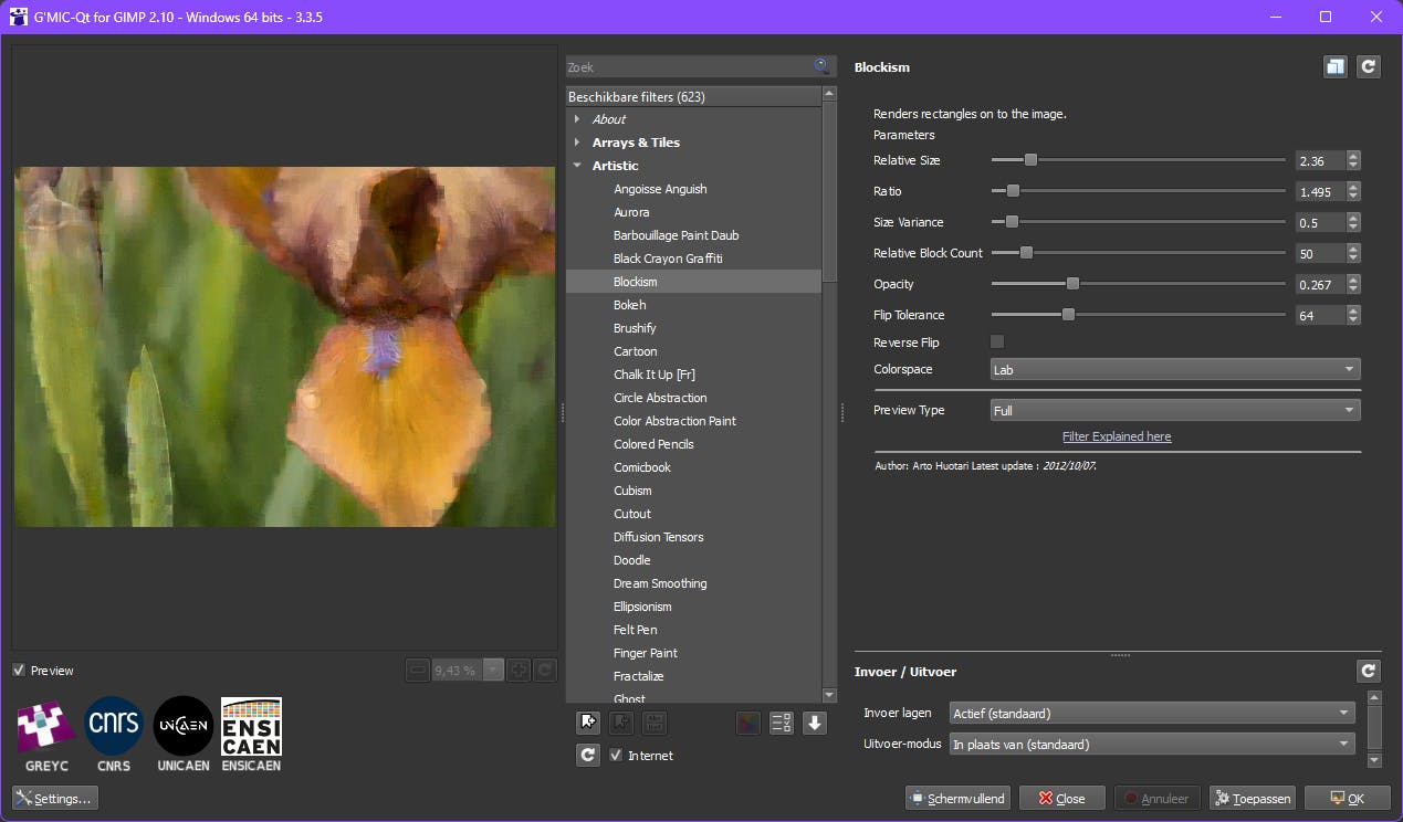 Neem bijvoorbeeld de plug-in G’MIC. Plaats alle uitgepakte bestanden in de plug-ins-map. Na het herstarten van GIMP vind je deze plug-in bij Filters / G’MIC Qt, waar je kunt kiezen uit zo’n vijfhonderd filters, verdeeld over ongeveer twintig categorieën, met vele aanpasbare parameters.
