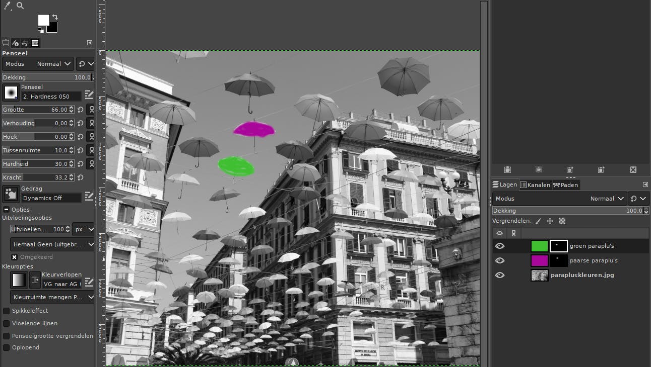 Open dus het laagvenster met Ctrl+L en stel de laagmodus in op Vermenigvuldigen. Kies vervolgens de gewenste voorgrondkleur, eventueel door een referentiefoto te importeren in GIMP en met het Pipet op een geschikte kleur te klikken. Rechtsklik in het lagenvenster, kies Nieuwe laag en geef deze een gepaste naam. Selecteer bij Vullen met de optie Voorgrondkleur. Klik daarna met rechts op zo’n laag en kies Laagmasker toevoegen, waarbij je kiest voor Zwart (volledig transparant). Stel zwart/wit in als hoofdkleuren, met wit als voorgrondkleur. Klik op het laagmasker (zwarte vierkantje) van een van je kleurlagen. Kies het Penseel en stel in het gereedschapsvenster de Hardheid en Kracht niet te hoog in (bijvoorbeeld 30). Kleur nu het gewenste deel in, terwijl je de muisknop ingedrukt houdt tijdens het kleuren.