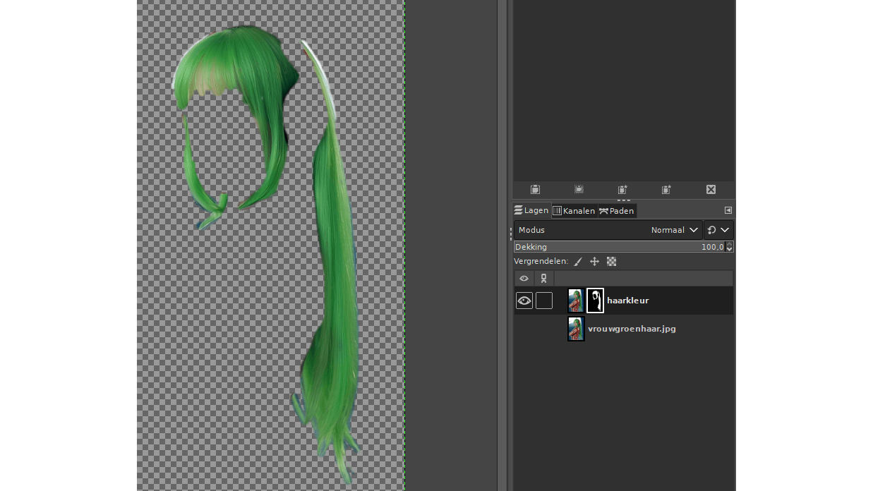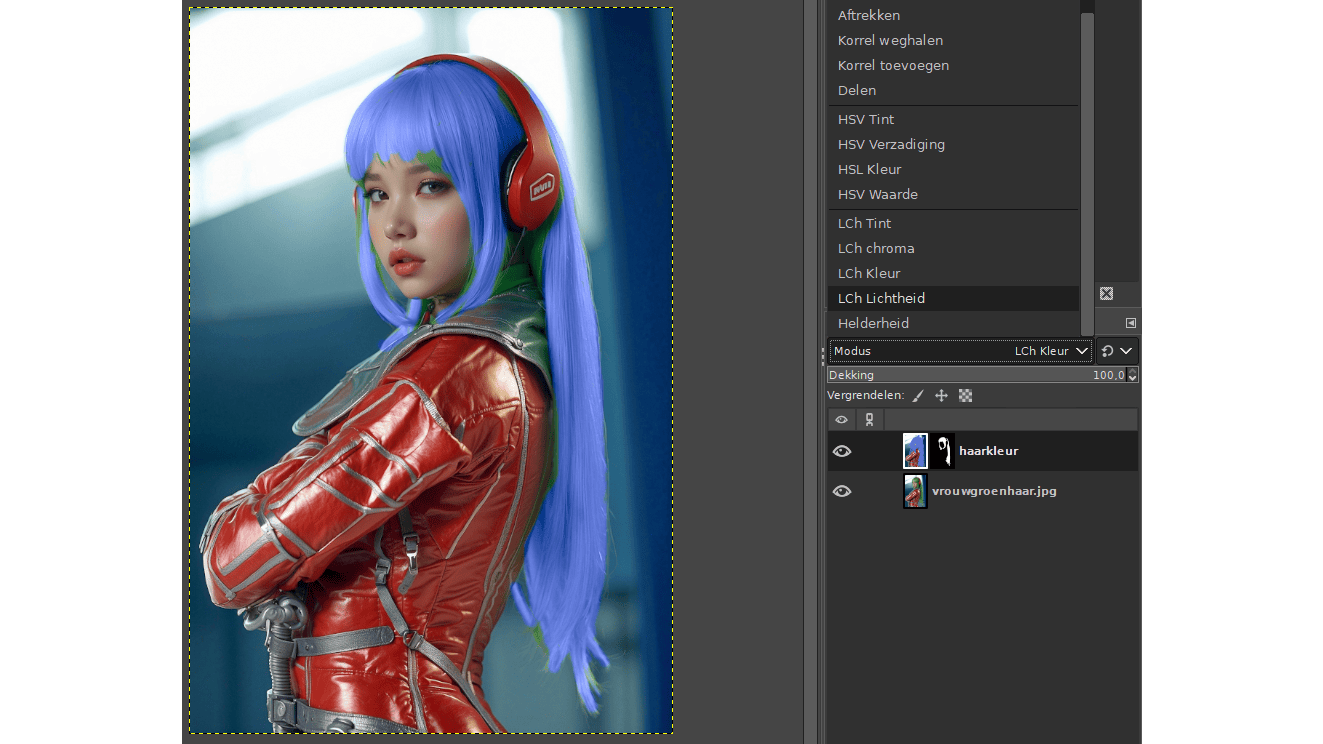 Nu ben je klaar om het haar in te kleuren of anderszins te bewerken. Maak de oorspronkelijke laag weer zichtbaar en kies de gekleurde miniatuur op de andere laag, naast het zwart-witpictogram van het laagmasker. Begin nu over de tekening te verven met een gekozen penseelkleur. Je zult zien dat de inkleuring zich keurig beperkt tot de contouren van je selectie. Een volledig egale inkleuring ziet er helaas vaak niet zo natuurlijk uit. Dit kun je snel aanpassen door met laagmodi te spelen. Houd je ingekleurde laag geselecteerd, klik op het pijlknopje rechtsboven in het laagvenster en er verschijnt een menu met verschillende laagmodi. De standaardinstelling is Normaal, maar experimenteer gerust met opties als HSV Tint, Hard licht of LCh Kleur voor het beste effect.