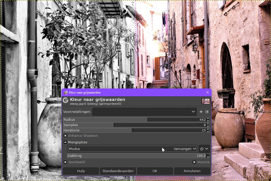 Zwartwitfoto’s hebben vaak een artistiekere uitstraling dan kleurenfoto’s. GIMP biedt diverse technieken om kleurenfoto’s naar grijswaarden te converteren, die je kunt uitproberen vanuit het menu Kleuren. Eén methode is via Grijswaarden / Grijswaarden, waarbij je zowel Voorbeeld als Voor/na activeert. Je kunt experimenteren met verschillende modi voor het kiezen van grijstinten (standaard is dit Helderheid) en voor het mengproces (standaard Vervangen), inclusief het aanpassen van het dekkingspercentage.