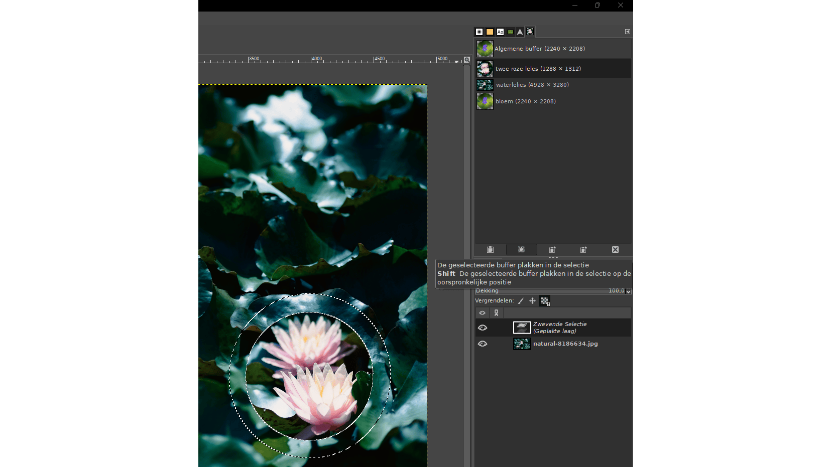 Bij het kopiëren en plakken van meerdere selecties of afbeeldingen is het gebruik van benoemde buffers aan te raden. Ga hiervoor naar Vensters / Dokbare vensters / Buffers. Voeg een afbeelding of specifieke selectie toe aan deze buffers via Bewerken / Buffers / Benoemde buffer kopiëren of knippen. Geef de buffer een passende naam en deze verschijnt in het venster. Herhaal voor alle gewenste objecten. Om een buffer ergens anders te plakken, selecteer je deze in het venster en plak je deze via het menu Bewerken of de knoppen onderaan het venster op de gewenste wijze, bijvoorbeeld in een selectie of als nieuwe laag.