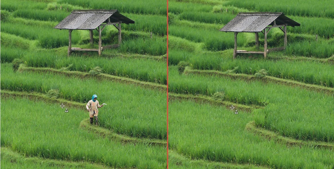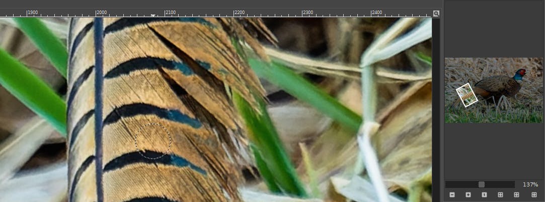 De Kloontool (sneltoets C) is meer geschikt voor het kopiëren van texturen of patronen. Selecteer met ingedrukte Ctrl-toets een bronpunt, laat los en schilder over het doelgebied. Het kan ook hier nodig zijn met verschillende bronpunten te werken. Probeer beide tools uit om te zien welke het beste voor jouw situatie werkt.