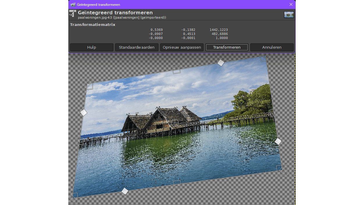 Als je een foto snel wilt schalen, draaien, kantelen, in perspectief wilt zetten, of zelfs meerdere van deze transformaties tegelijk wilt toepassen, gebruik dan het Geïntegreerd transformeergereedschap. Deze activeer je met Shift+T. Er verschijnen verschillende handvatten rond je foto.