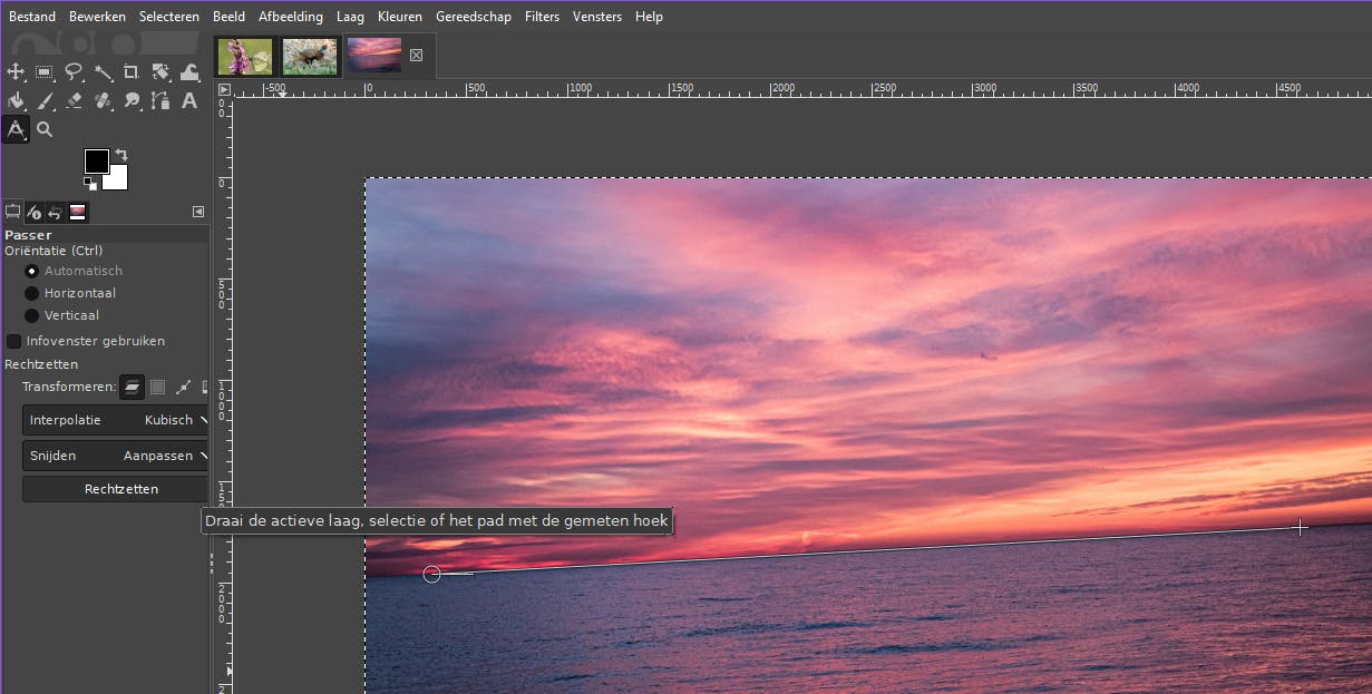 Het overkomt iedereen weleens: je maakt een foto en achteraf blijkt dat de horizon of een rij huizen niet perfect horizontaal is. Geen zorgen, dit kun je in GIMP eenvoudig rechttrekken. Gebruik hiervoor Passer, deze tool activeer je met Shift+M of via Gereedschap / Passer.