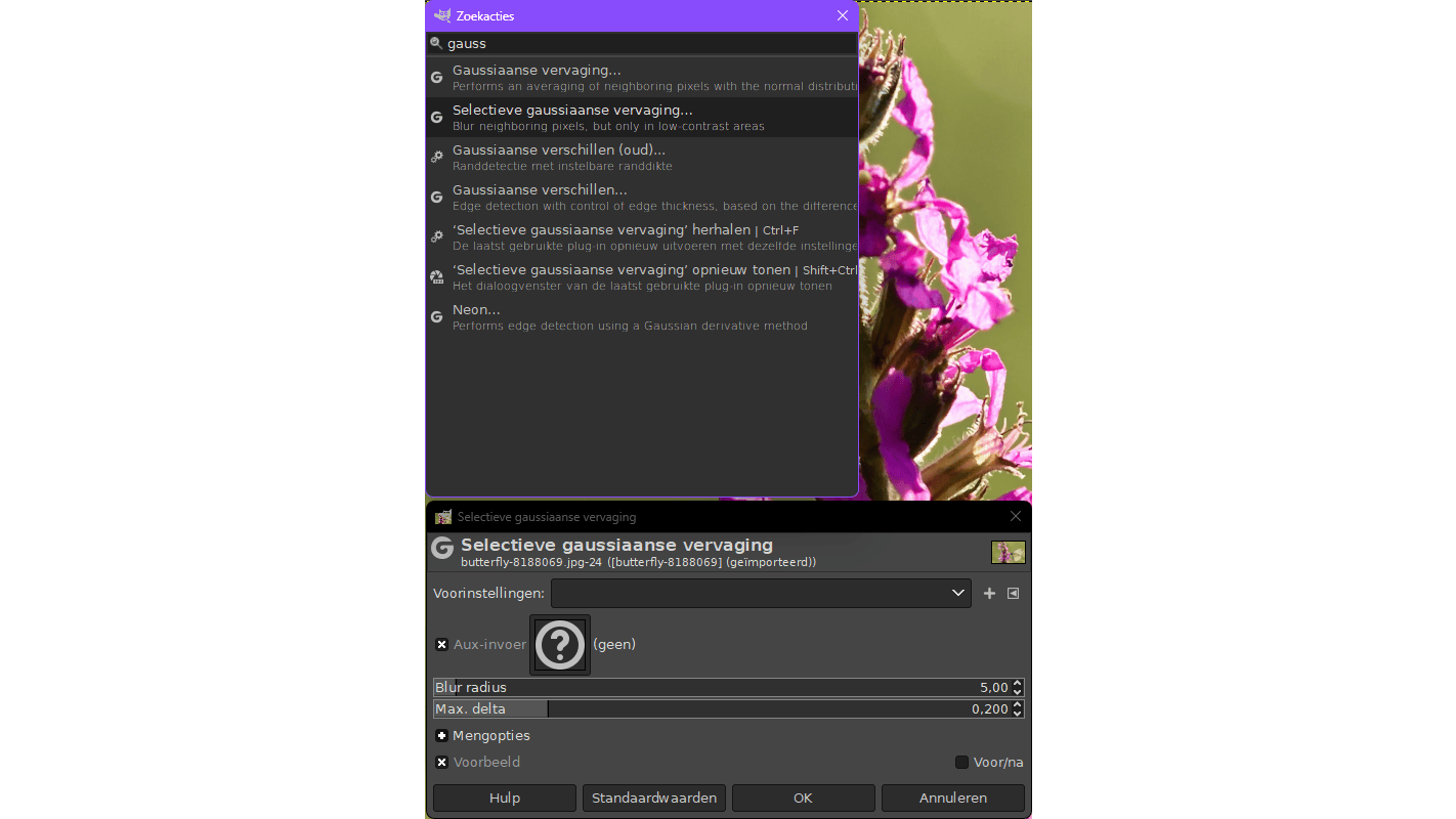 Een krachtige functie is de ingebouwde zoekfunctie. Open een afbeelding, druk op de /-toets en voer een functienaam of deel van een afbeeldingsnaam in. Bij het typen van bijvoorbeeld gaussiaans krijg je meerdere gerelateerde items te zien. Een klik op een van deze items opent direct de bijbehorende functie, wat heel wat zoektijd kan besparen. Erg handig is ook dat je bij het aanwijzen van een of ander menu-item alleen maar op de F1-toets hoeft te drukken voor contextgevoelige hulp.