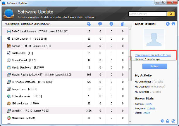 Glarysoft Software Update onderzoekt uw computerprogramma's en laat zien of u over de meest recente versie beschikt.