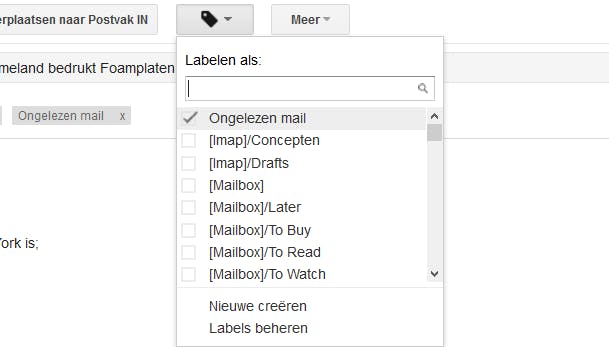 Je kunt labels heel eenvoudig handmatig toekennen. Wanneer je een mail ontvangt die onder een bepaald label zou moeten vallen, dan selecteer je de mail (plaats er een vinkje voor of open deze) en klik je vervolgens op het pictogram met het label bovenin het scherm (naast de knop Meer).
