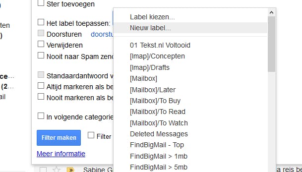 Wanneer je nu klikt op Filter maken wordt het filter aangemaakt en worden mails die voldoen aan de criteria die je hebt opgegeven automatisch voorzien van een label, waardoor het aan de zijkant net is alsof ze in een 'map' verschijnen.