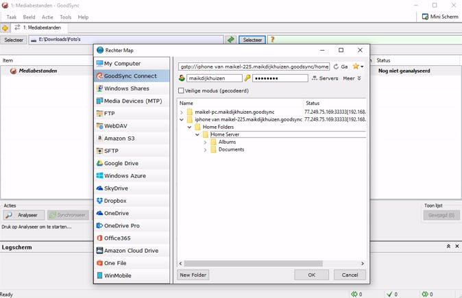 De gebruikersinterface van GoodSync kan wel een likje verf gebruiken. Het ziet er allemaal wat gedateerd uit met ellenlange menu's. In de instellingen wijzig je de taal eventueel naar het Nederlands, maar schrik niet van de vele vertaalfouten. De werking is gelukkig vrij eenvoudig. Aan de linkerkant geef je aan welke map je wilt synchroniseren of back-uppen. In het rechterdeelvenster selecteer je vervolgens de doellocatie. Wanneer je een GoodSync Connect-account hebt aangemaakt, herkent het programma automatisch andere servers in het netwerk. Daarnaast zijn er nog tal van andere methoden om bestanden uit te wisselen. GoodSync spoort simpel gedeelde mappen, ftp-servers en WebDAV-bronnen op. Verder hebben de makers de clouddiensten Google Drive, Dropbox en OneDrive binnen het programma geïntegreerd. De communicatie met online servers werkt in de praktijk vlekkeloos.