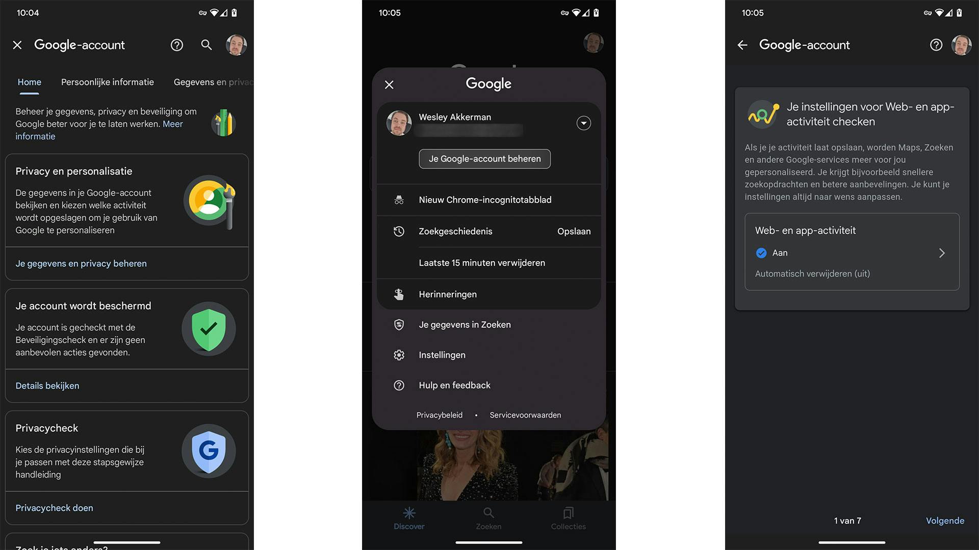 Als je dezelfde pagina op je smartphone of tablet wilt bereiken, dan ga je als volgt te werk. Open de Google-app op dat apparaat en log in (indien nodig, maar waarschijnlijk ben je al ingelogd). Druk dan rechtsboven op je profielfoto en selecteer de optie Je Google-account beheren. Trek het scherm een klein beetje naar boven terwijl je op het tabblad Home bent. Dan zie je vanzelf Privacycheck staan. Daaronder staat de tekst Privacycheck doen; daar kun je op klikken. Ook hier komen zeven stappen in beeld te staan. De opties zijn hier niet anders dan wanneer je in de browser werkt.