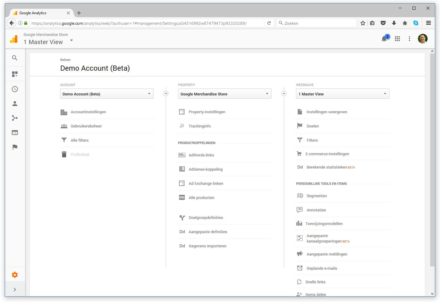 Google Analytics kent een hiërarchische structuur met drie niveaus: account, properties en weergaven. Onder een account kunnen tot 50 properties hangen die elk uit een of meerdere (tot 25) weergaven kunnen bestaan. Hoe gebruik je ze zinvol? Na je aanmelding heb je feitelijk al een Google Analytics-account met binnen dat account een eerste property. Die property heeft een hoofdweergave die alle websitegegevens toont, en heeft zijn eigen Universal Analytics-trackingcode.