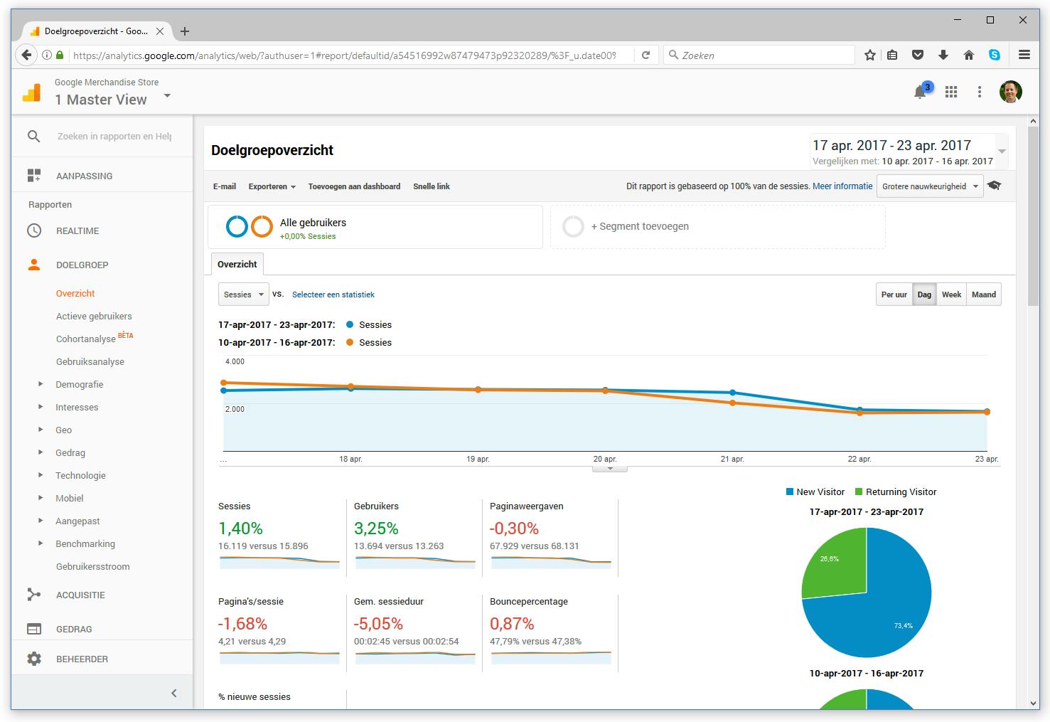 Als voorbeeld nemen we het rapport Overzicht in de rubriek Doelgroep. Hier zie je zaken als aantal sessies, paginaweergaven, gemiddelde sessieduur en pagina’s per sessie. Standaard worden de laatste dertig dagen getoond. Rechtsboven kun je die periode aanpassen.