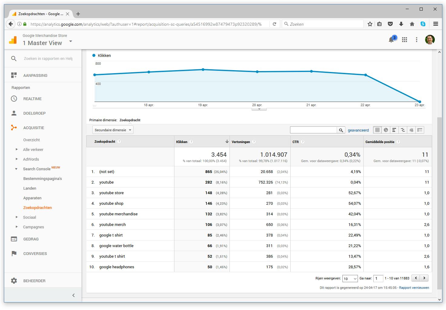 Ga je nu terug naar Zoekopdrachten, dan kun je onderzoeken op welke termen mensen binnenkomen. Belangrijk is Gemiddelde positie dat inzicht geeft in de ranking van je website voor zoekopdrachten. Je hebt eigenlijk alleen goede kansen als jouw website bij de bovenste zoekresultaten opduikt.