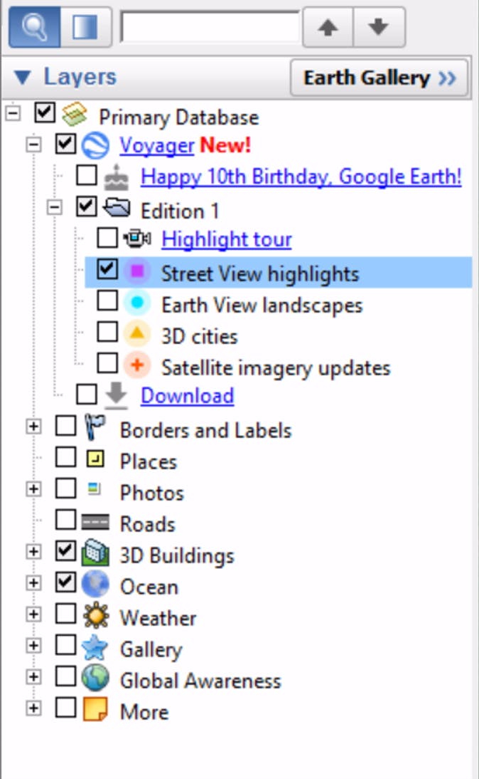 Voyager is een geheel nieuwe functie in de desktopversie van Google Earth. Hiermee kun je snel geweldig nieuw beeldmateriaal van over de hele wereld vinden. De verschillende soorten beeldmateriaal zijn in vijf categorieën onderverdeeld en worden met een aparte kleur aangeduid.