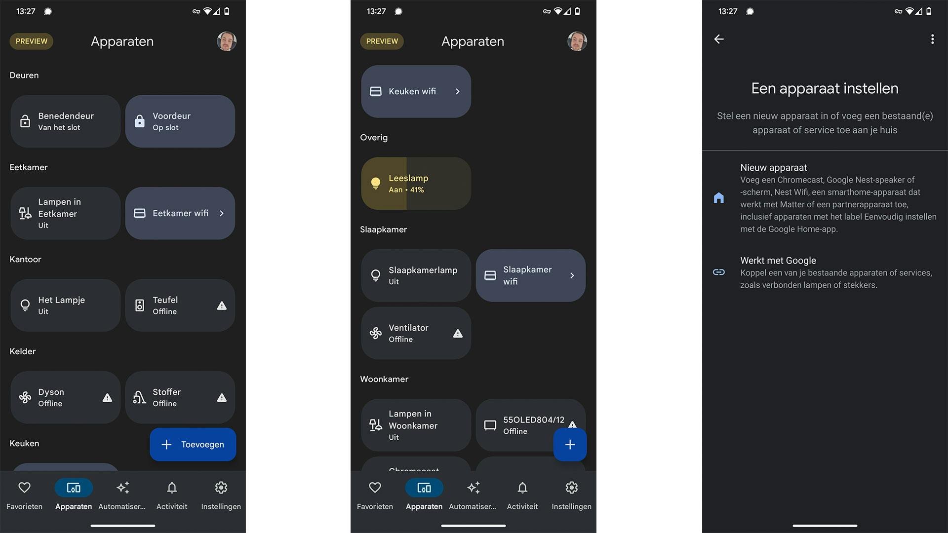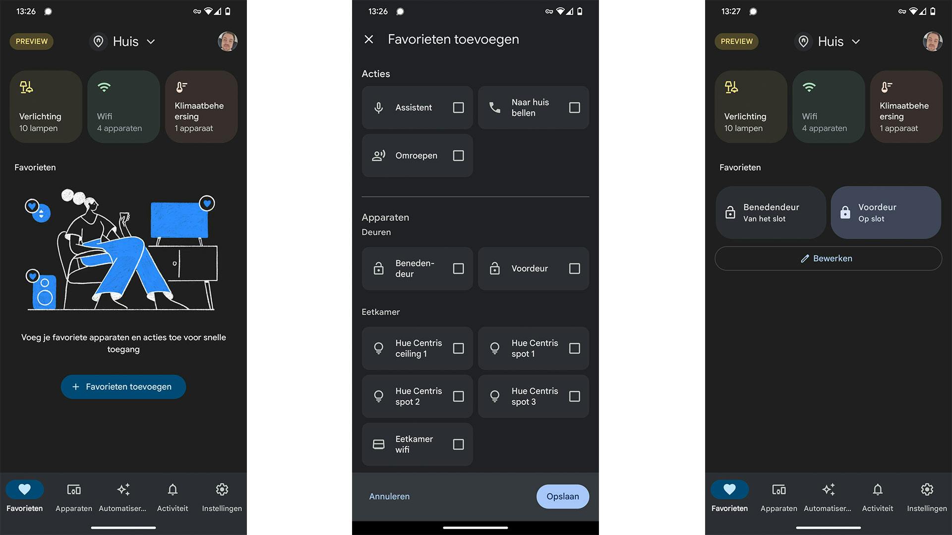 Voortaan is de Google Home-app opgedeeld in vijf overzichtelijke tabbladen, namelijk Favorieten, Apparaten, Automatiseringen, Activiteit en Instellingen. De eerste tab die je ziet na het openen van de app, is Favorieten. Hier staan bijvoorbeeld je slimme lampen, maar ook je wifi en de klimaatbediening (voor de verwarming en airco). Je kunt als gebruiker zelf favorieten toevoegen. Dat kunnen bepaalde acties zijn, zoals naar huis bellen of iets omroepen.