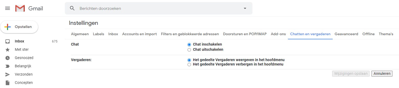 Klik dan ook rechtsboven op het tandwiel-icoontje en kies Alle instellingen bekijken. Ga dan naar het tabblad Chatten en vergaderen en kies de optie Het gedeelte Vergaderen verbergen in het hoofdmenu. Eventueel kies je ook voor Chat uitschakelen, we kennen weinig mensen die nog via Hangouts met elkaar communiceren. Klik op Wijzigingen opslaan. Je inbox wordt opnieuw geladen zonder de Meet- en Hangout-opties.