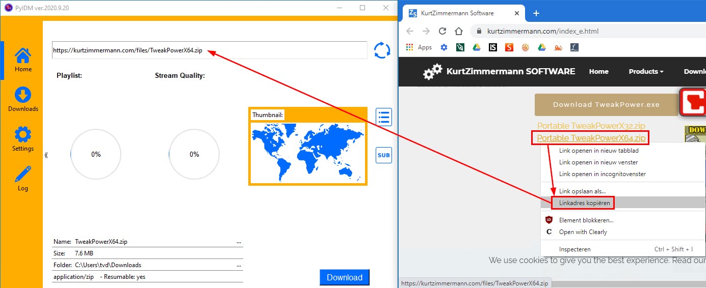 Zodra je, wellicht vanuit een webpagina, een webadres naar het klembord kopieert met Ctrl+C of door in het contextmenu van die link op (iets als) Linkadres kopiëren of Koppeling kopiëren te klikken, pikt PyIDM de url op en vult die netjes voor je in de tekstbalk in.