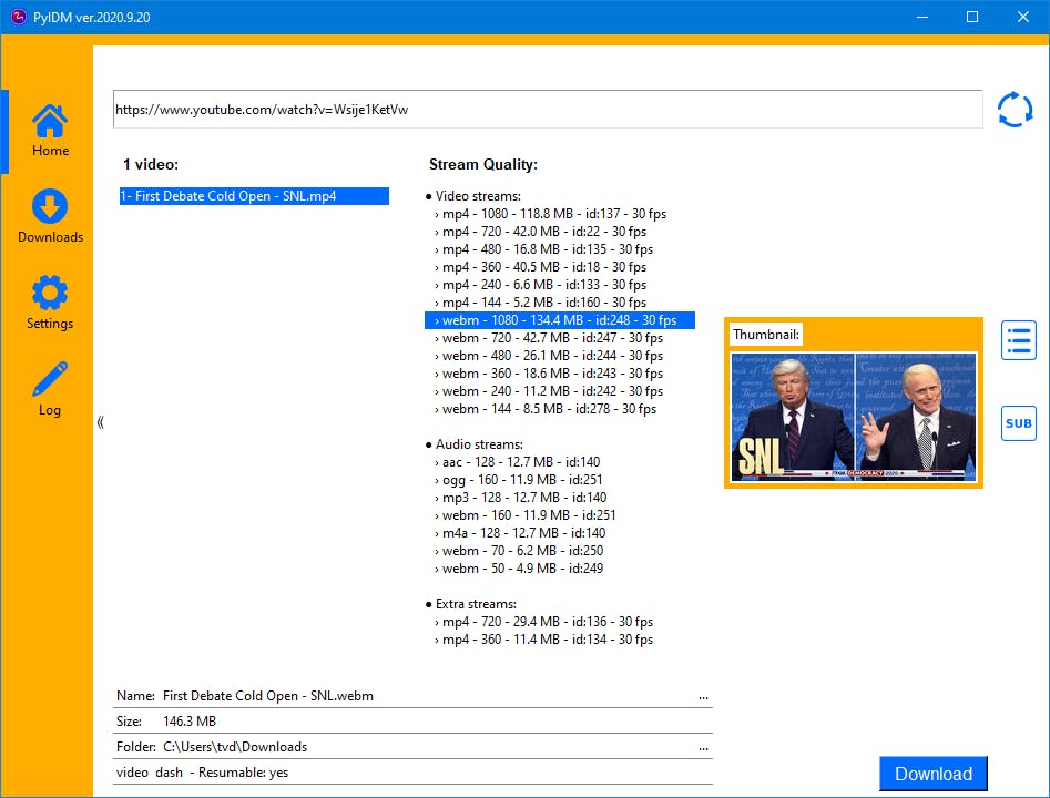 De url verschijnt in het Home-venster van PyIDM, maar de analyse kan wel even duren. Immers, de tool gaat ook na welke video- en audio-streams beschikbaar zijn: die verschijnen dan bij Stream Quality. Rechts ervan krijg je een miniatuurafbeelding van de video te zien. Je hoeft de gewenste stream maar te selecteren en op de knop Download te klikken.