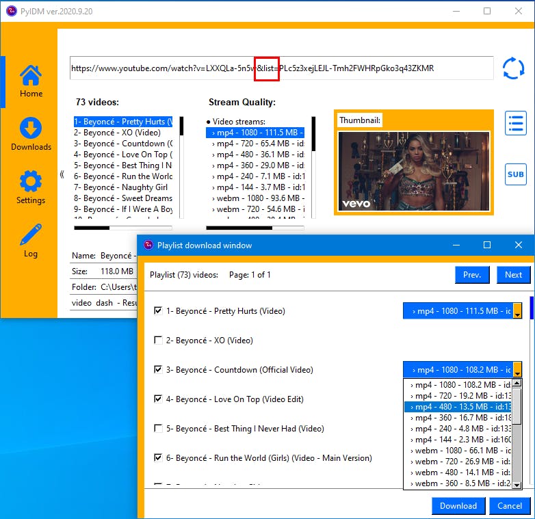 Gaat het om een playlist, te herkennen aan &list=<id> in de video-url van YouTube, dan kun je in het hoofdvenster de video aanduiden die je wenst. Wil je meerdere video’s uit deze afspeellijst binnenhalen, klik dan op de knop met de drie horizontale strepen, plaats een vinkje bij de gewenste video’s en kies het geschikte bestandsformaat in het uitklapmenu bij elke video.