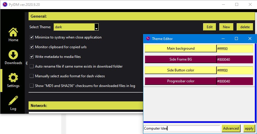 Helemaal bovenaan kun je nog uit een handvol (kleuren)thema’s kiezen voor de PyIDM-interface. Of je kiest gewoon je eigen kleuren via New (en Advanced). Vul een geschikte themanaam in en bewaar die met Apply.
