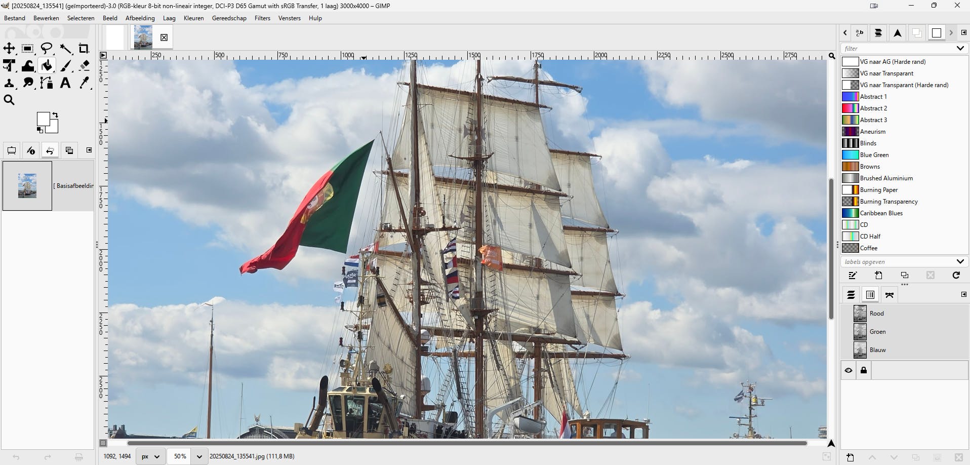 De titelbalk van de afbeelding die je hebt geopend, geeft in Gimp belangrijke informatie. Zo lees je in de titelbalk onder meer de bestandsnaam af, maar ook welke afmetingen het bestand heeft. Ook zie je hier welke kleurindeling wordt gebruikt, bijvoorbeeld RGB-kleur 8-bit, en uit hoeveel lagen de afbeelding is opgebouwd.