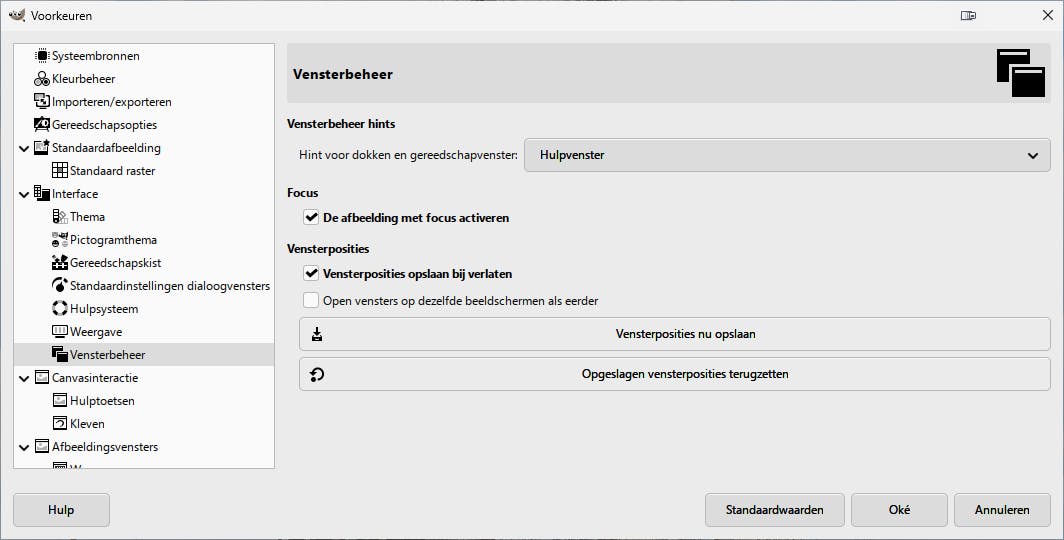 Ben je tevreden over je eigen indeling? Dan kun je deze direct opslaan. Kies dan Bewerken / Voorkeuren / Interface / Vensterbeheer. Klik op Vensterposities nu opslaan. Standaard wordt de werkomgeving bewaard zodra je het programma afsluit (controleer of Vensterposities opslaan bij verlaten is geactiveerd).