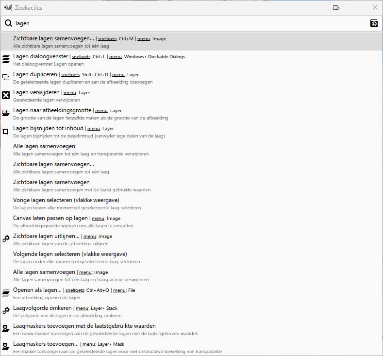 In het zoekoverzicht toont Gimp alleen opties die met het trefwoord te maken hebben. Klik op een resultaat om de functie daadwerkelijk uit te voeren. Bij elke functie zie je ook waar deze zich in het programma bevindt, zodat je deze een volgende keer zelfstandig kunt uitvoeren.