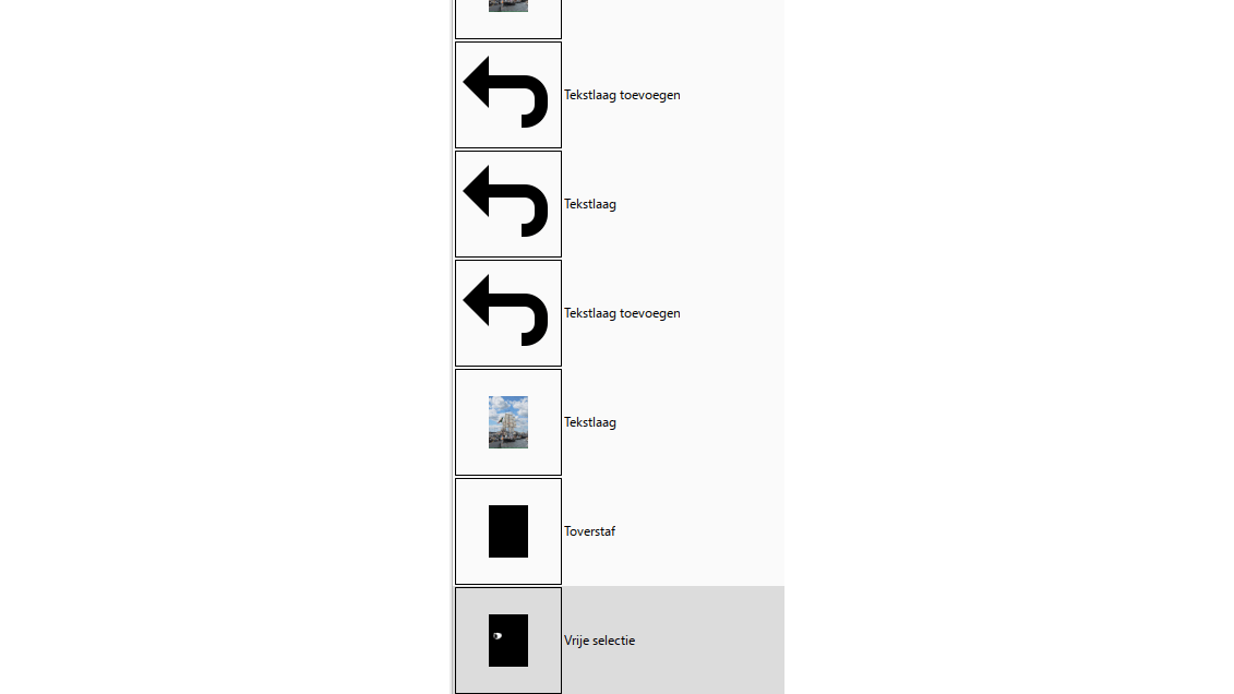 Alle bewerkingen die je op een afbeelding toepast, worden vastgelegd in de geschiedenis. Dit tabblad wordt standaard links in het venster getoond en vult zich naarmate je de acties toepast. Om terug te keren naar een punt in het verleden, klik je op de actie in de lijst. De geschiedenis is handig, omdat je hiermee ziet welke acties je hebt uitgevoerd en kunt experimenteren met verschillende bewerkingen.