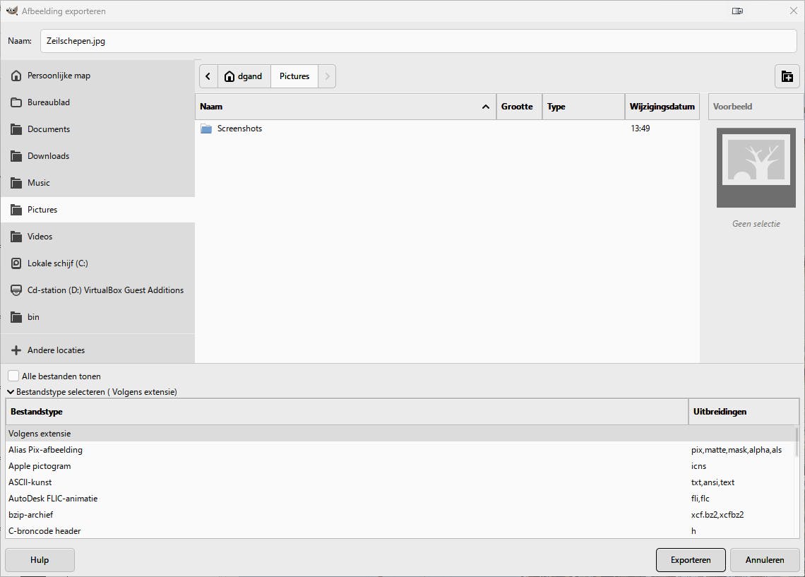 Ben je klaar met een bestand, kies dan Bestand / Exporteren als. In het venster geef je een bestandsnaam op en bepaal je de locatie. Werp hierna een blik op Bestandstype selecteren. Kies de gewenste indeling, zoals gif-afbeelding of png-afbeelding. Het valt hierbij op dat Gimp ook exotischere grafische formaten ondersteunt, zoals Windows-pictogrammen of Windows-cursors.