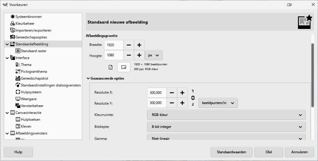 Mogelijk werk je vaak met dezelfde soort afbeeldingen, bijvoorbeeld met dezelfde afmetingen. Je kunt tijd besparen door in Gimp deze waarden als standaard in te stellen. Kies Bewerken / Voorkeuren / Standaardafbeelding. Ga uit van een sjabloon, dat je eventueel nog kunt aanpassen.