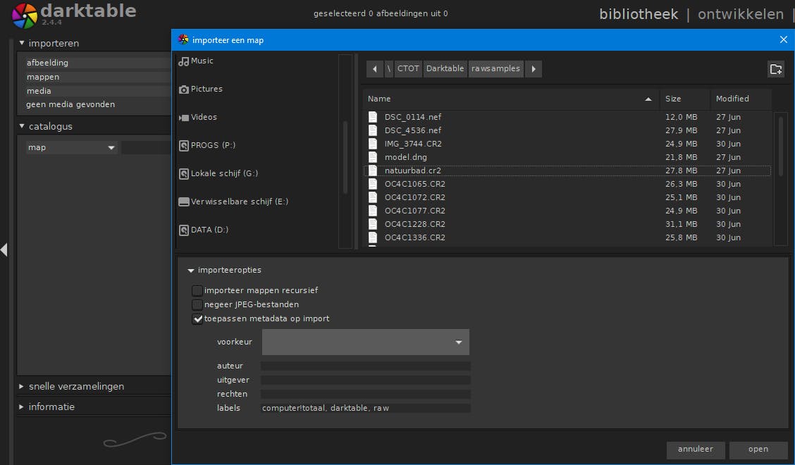 Open de bibliotheek en klik importeren aan. Je kunt nu je raw- of andere fotobestanden rechtstreeks uit je camera importeren (media) of opzoeken op schijf (afbeelding of mappen). Gedeelde netwerkmappen vindt darktable echter niet terug, tenzij je daar via de Verkenner een netwerkverbinding voor hebt gecreëerd. Onderaan het importvenster tref je enkele importeeropties aan. Selecteer hier importeer mappen recursief indien je ook submappen wilt meenemen en plaats een vinkje bij toepassen metadata op import om je foto’s al van bepaalde labels te voorzien (gescheiden door een komma). De geïmporteerde foto’s verschijnen in de groep snelle verzamelingen.