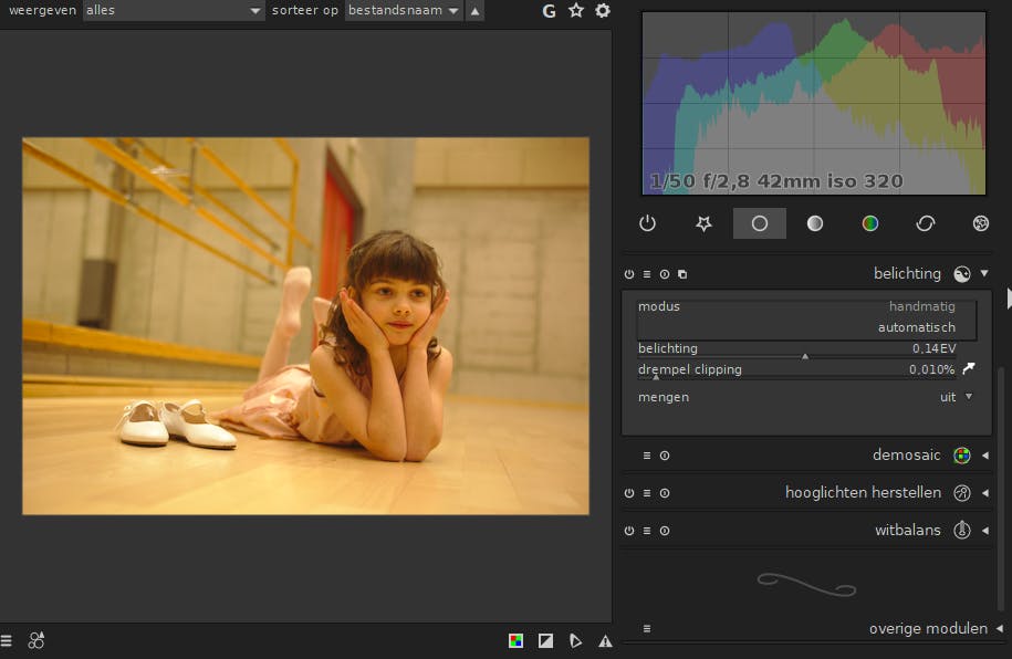 Laten we eerst de belichting van onze foto aanpakken. Klik het knopje modules voor basisbewerkingen aan en open de module belichting. Je kunt het proberen door de modus op automatisch te zetten. Geeft dat niet het verhoopte resultaat, zet het dan op handmatig en verplaats het schuifknopje bij belichting naar rechts. Je merkt dat het witte vlak mee naar rechts beweegt. Normaliter zorg je er liefst voor dat dit vlak niet wordt afgesneden maar mooi nabij de rechteronderhoek eindigt. Overigens kun je ook de belichting regelen per kleur door de rgb-knoppen rechtsboven het histogram in of uit te schakelen.