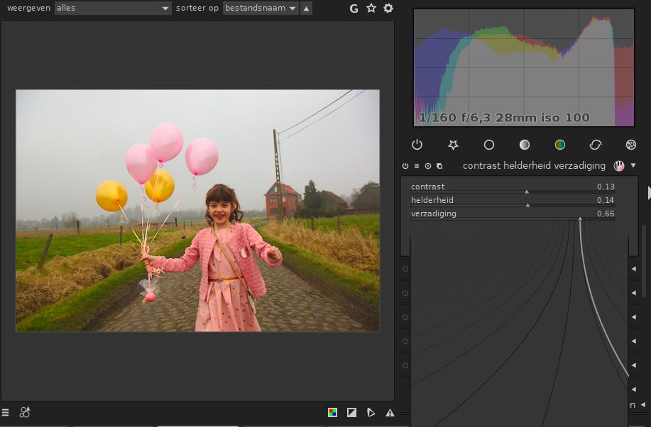 Een niet optimale belichting is niet het enige probleem bij foto’s; het gebeurt wel vaker dat de kleuren iets te fel of wat te flets ogen. Dat regel je snel bij met de module contrast helderheid verzadiging, die zich eveneens in de groep modules voor basisbewerkingen bevindt. Door het schuifknopje bij verzadiging wat naar rechts te verplaatsen, bezorg je de kleuren een diepere tint. Maar het kan ook anders. Klik met de rechtermuisknop op de schuifknop; er verschijnt nu een paneel met curves. Via de muis kun je zo’n curve bewegen. Hoe hoger in de curve, hoe groter het effect. Dat geldt trouwens voor meerdere aanpassingen.