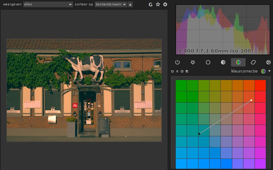 Verzadiging bijsturen is één manier om de kleuren te optimaliseren, maar darktable heeft nog veel meer opties. Je vindt er een aantal in de groep modules om kleur te corrigeren. Kies hier kleurcorrectie. Je ziet een raster met verschillende kleuren met een wit en zwart bolletje. Door deze bolletjes te verslepen pas je ‘split toning’ toe, waarbij je verschillende kleuren toevoegt aan de hooglichten (wit) en/of de schaduwpartijen (zwart), bijvoorbeeld om een vintage effect te verkrijgen. Via het muiswieltje pas je meteen ook de verzadiging aan.