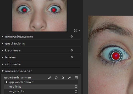 ‘Rode ogen’ blijft een vervelend fenomeen. In darktable zul je vergeefs zoeken naar een ‘red eye removal’-module, dus je zult het anders moeten aanpakken. Je creëert eerst een masker voor elk van beide ogen. Open masker-manager links van de voorbeeldweergave en klik de cirkelvorm aan. Teken hiermee een cirkel over een van de pupillen. Met het scrolwiel bepaal je de grootte van de cirkel en – indien je scrolt binnen de cirkelrand – van de uitvloeiende rand. Herhaal deze procedure voor de andere pupil. Geef je maskers een gepaste naam.