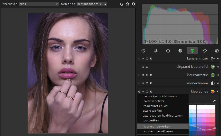Darktable laat je ook handig gebruik maken van bepaalde voorinstellingen. Stel, je hebt een portretfoto gemaakt en je wilt die snel van een meer natuurlijke huidskleur voorzien. Activeer dan de module kleurzones en klik linksboven de module op het knopje voorkeuren. Er verschijnen nu diverse profielen, waaronder natuurlijke huidskleuren. Met wat geluk levert die meteen het gewenste resultaat op. Je kunt echter ook je eigen aanpassingen bewaren: klik voorkeuren en kies voorkeur opslaan. Eventueel plaats je een vinkje bij toon deze voorkeur alleen bij overeenkomstige afbeeldingen; stel vervolgens zelf de criteria in.