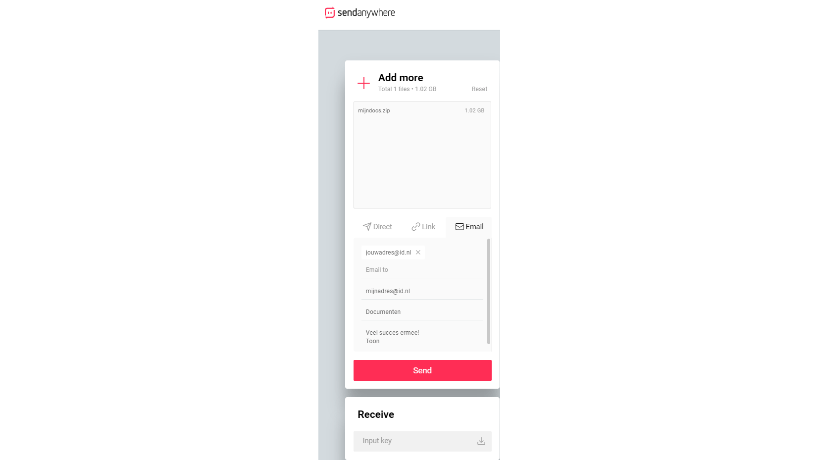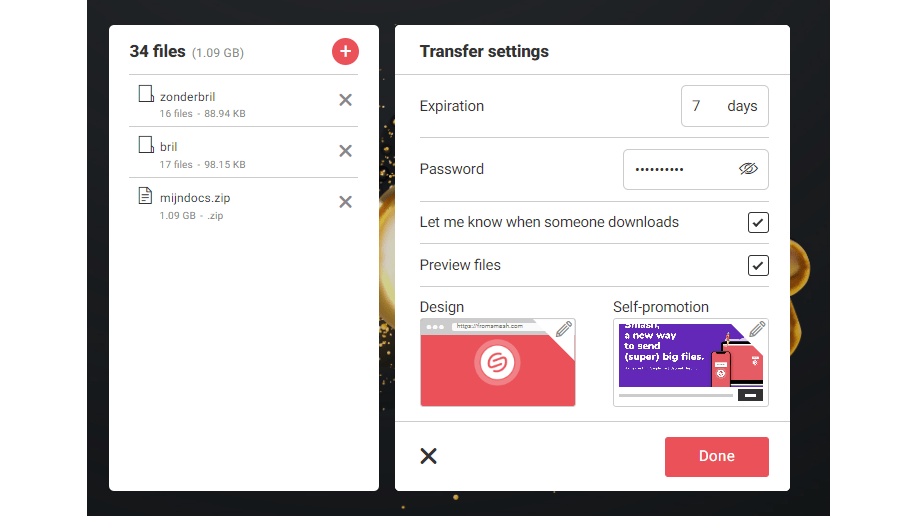 Smash heeft in theorie geen uploadlimiet, maar in de praktijk betekent dit dat je in een wachtrij komt zodra je meer dan 2 GB wilt uploaden. Als grootte belangrijker is dan snelheid, biedt Smash een goede oplossing. Net als bij andere diensten kun je kiezen tussen het genereren van een uploadlink of het verzenden van een e-mail met de link. Je upload kan ook met een wachtwoord worden beschermd.