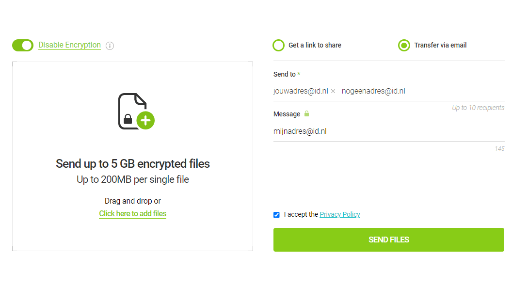 De uploadlimiet is 2 GB. De data worden versleuteld (met AES-256) opgeslagen op de servers, maar je kunt geen wachtwoord instellen. Zowel de verzender als de ontvanger ontvangen een melding van de verzending. Daarnaast krijg je een bericht zodra de ontvanger de data heeft gedownload. Voor elke upload moet je een verificatiecode invoeren die je via de e-mail ontvangt, maar dit is niet nodig bij een gratis account.