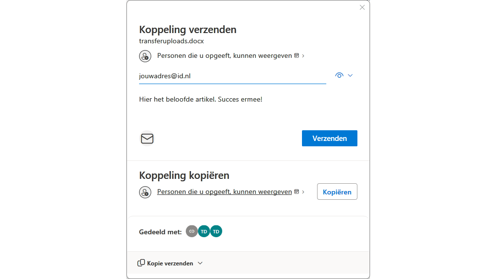 Cloudopslagdienst Naast gespecialiseerde transferdiensten kun je klassieke cloudopslagdiensten gebruiken om bestanden te uploaden en te delen. Voorbeelden zijn Google Drive, OneDrive en Dropbox. Bij deze diensten deel je specifieke bestanden die al in je opslagruimte staan. Je hebt meestal de mogelijkheid om te bepalen welke rechten je aan ontvangers geeft, zoals alleen lezen of ook bewerken. Vaak is het mogelijk een verloopdatum aan de deellink toe te voegen, waarna de toegang vervalt.
