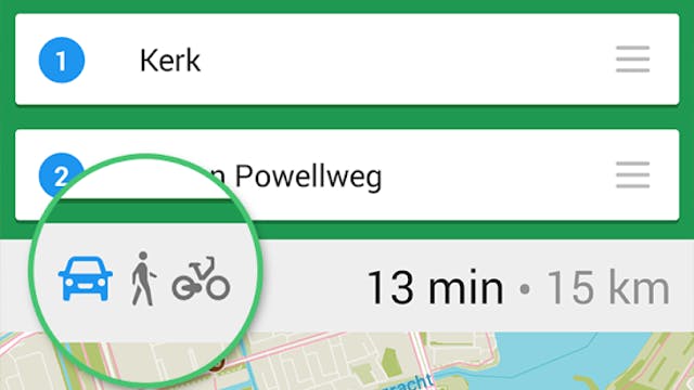 Standaard wordt de route berekend voor autorijden. Mocht je het willen, dan is het mogelijk om ook te kiezen uit alternatieve manieren van transport: wandelen, fietsen, OV of taxi. Allemaal heel flexibel dus. Vooral de OV-optie is mooi, maar deze werkt nog niet overal ter wereld. In dit voorbeeldje gaan we uit van een autorit. Tik op Beginnen om de navigatie te starten. De kaartweergave is mooi en prima bruikbaar. Wil je tijdens het rijden verkeersinformatie krijgen - ook al kosteloos - dan tik je in de navigatiemodus op de knop met de drie streepjes onder in beeld, gevolgd door een tik op het stoplicht. Rijden maar!