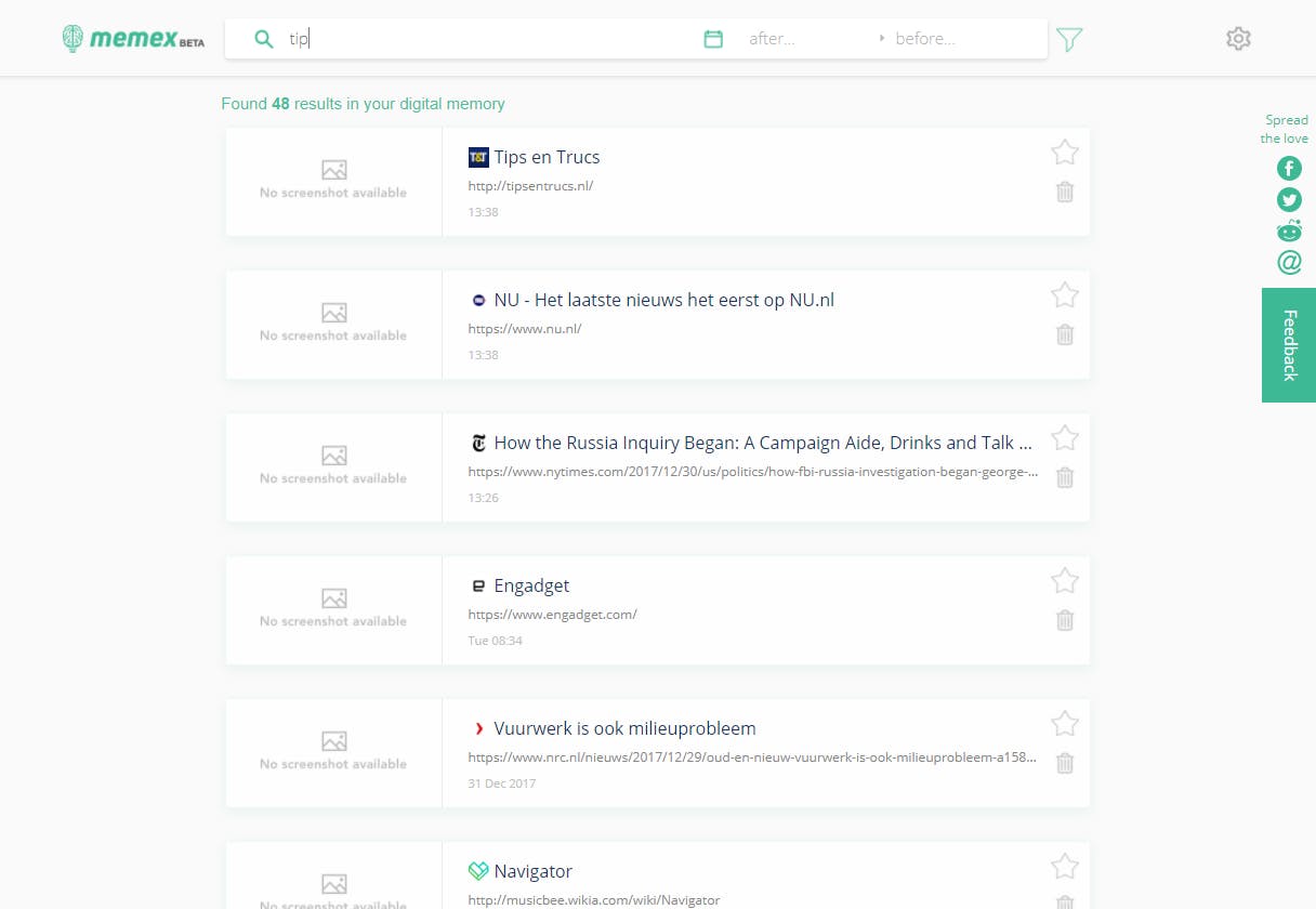 Af en toe kom je een programma tegen waarvan je meteen weet: dit gaat mijn leven een stuk gemakkelijker maken. Memex van WorldBrain is er zo eentje. Het overkomt ons allemaal weleens: ben je een tijdje aan het surfen, bedenk je opeens dat je die ene site weer terug wilt vinden. Maar hoe? Je kunt de geschiedenis van je browser doorzoeken, maar daar staan alleen maar titels en links, en dat is niet altijd even behulpzaam. Memex slaat de content van alle sites die je hebt bezocht lokaal op, zodat je ze kunt doorzoeken op tekst. Dus weet je nog waar de site over ging, dan kun je ‘m met Memex weer vinden. Het programma is te installeren als extensie voor Chrome, Firefox en Opera. Nadat je dat hebt gedaan, kun je eerder bezochte sites of bladwijzers importeren, zodat je ook die kunt doorzoeken. Om een pagina te vinden, typ je in de adresbalk van je browser een w, gevolgd door een spatie en de zoekwoorden. Daarna laat Memex meteen alle url’s zien van sites waar die woorden in voorkomen. De eerste link toont een overzicht van de gevonden websites. Vind je zoeken in de adresbalk lastig? Als je op het logo van de extensie klikt, naast de adresbalk, krijg je een keurig zoekvenster.