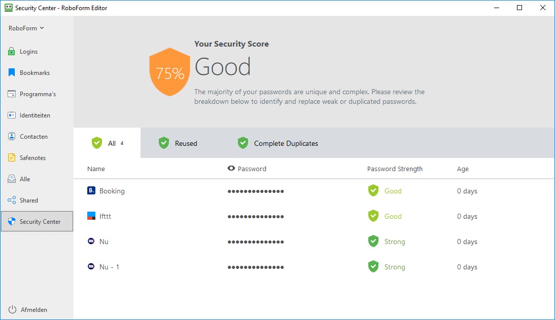 We weten allemaal dat we voor elke website en ieder programma een ander wachtwoord moeten gebruiken als we ons registreren. Mochten hackers je wachtwoord onverhoopt in handen krijgen, dan kunnen ze die maar op één plek gebruiken. Er zijn echter maar weinig mensen die ook daadwerkelijk steeds unieke wachtwoorden verzinnen. Meestal omdat dat te veel gedoe geeft. Een wachtwoordmanager, zoals RoboForm, is dan ideaal. Dit gratis programma slaat al je wachtwoorden op, bedenkt nieuwe voor je als het nodig is en vult ze automatisch voor je in als je ergens wilt inloggen. RoboForm gebruikt daarvoor aes-256bit-encryptie en zorgt ervoor dat elk nieuw wachtwoord minimaal acht tekens lang is. Dankzij de integratie in je browser is het aanmaken van nieuwe logingegevens gemakkelijk te doen: zodra je iets moet invullen schiet RoboForm je te hulp. Daarnaast kun je dankzij de gelijknamige app ook op je mobiel bij alle wachtwoorden die je op je pc hebt aangemaakt. Nieuw in versie 8 is Security Center, dit onderdeel vertelt je hoe sterk je wachtwoorden zijn en of je niet ergens per ongeluk dubbele gebruikt.