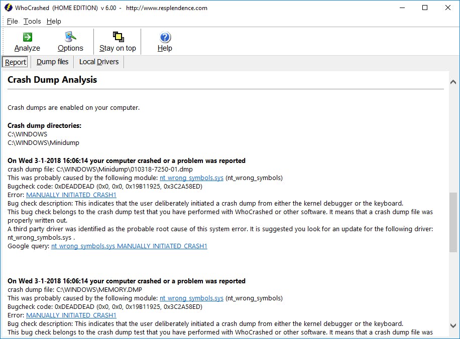 Staat je pc plotseling stil en geeft hij geen sjoege meer? Of start je computer opeens opnieuw op? Ontzettend irritant – helemaal als je erachter zit te werken. Vaak is een corrupte driver de oorzaak. Maar welke? WhoCrashed helpt je om de schuldige te vinden. Het programma analyseert de ‘crash dumps’ (een kopie van het geheugen van de computer op het moment van de crash) en vertelt je vervolgens welke driver moet worden verwijderd of opnieuw geïnstalleerd. Gebruikmaken van WhoCrashed is heel simpel: nadat het programma is geïnstalleerd, klik je op Analyze. Vervolgens krijg je onder de knop Report een gedetailleerd overzicht van wat er mis is gegaan.