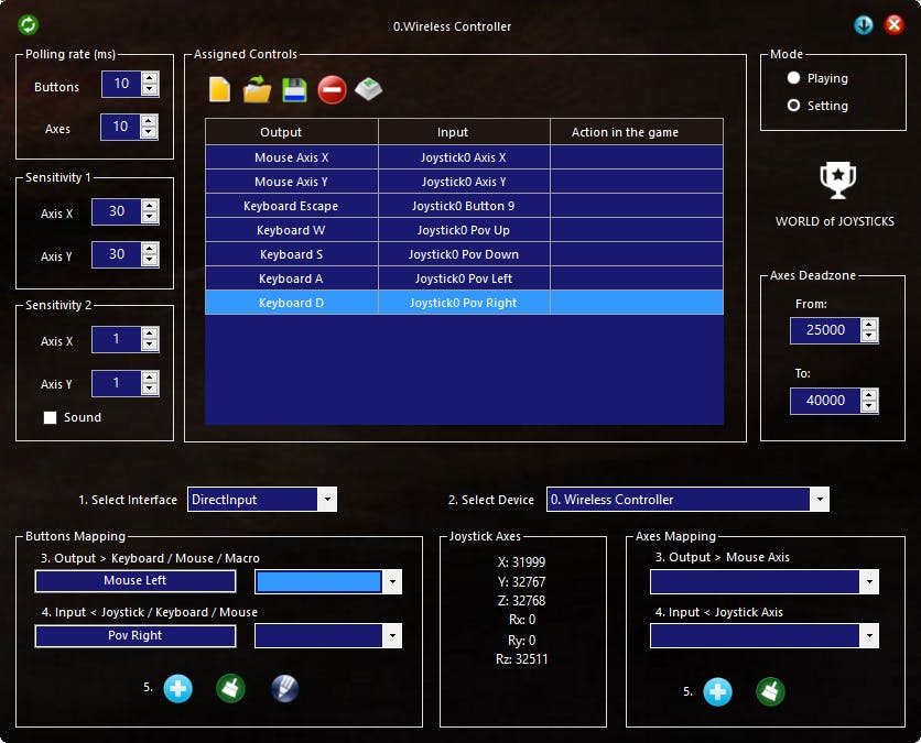 Sommige pc-games spelen een stuk beter met een controller. Bijvoorbeeld racegames spelen veel fijner met een goeie Xbox-controller of PlayStation DualShock in je handen, dan met de toetsen van je toetsenboard. Niet iedere controller wordt echter ondersteund. De oplossing daarvoor is World of Joysticks, een programma dat de bewegingen van de D-pad, sticks of knoppen van je joysticks omzet in toetsaanslagen. Erg eenvoudig is de software niet. Nadat je het programma hebt geïnstalleerd, krijg je een wirwar aan instellingen voorgeschoteld. Sluit je joystick aan op je pc, en wiebel met alle pookjes en druk op alle knoppen om onder Joystick Axes te zien hoe de bewegingen worden geregistreerd. Door onder Axes Mapping aan te geven welke sticks voor de horizontale en verticale bewegingen zorgen, kun je de muis met je joystick bewegen. Kies onder Output voor Axis X, en kies de corresponderende stick onder Input. Welke dat is, verschilt per model. Klik vervolgens op de + om de selectie vast te leggen. Doe hetzelfde voor Axis Y. Onder Buttons Mapping kun je de knoppen op de joystick toewijzen aan toetsaanslagen. In games worden de toetsen W, S, A en D gebruikt voor de besturing. Klik op Output en druk dan op de W op je toetsenbord. Selecteer vervolgens Input en druk op de D-pad naar boven. Klik daarna op de + om de selectie vast te leggen. Doe hetzelfde voor de andere toetsen, tot je alle knoppen hebt ingesteld. Wil je zien of het werkt? Kies dan onder Mode voor Playing. Beweeg met de sticks om te zien of je de muis goed kunt verplaatsen. Klik ten slotte op de floppy om je configuratie op te slaan. Als je alle toetsen hebt gekoppeld, kan het gamen beginnen. Voor meer uitleg, bekijk het filmpje
