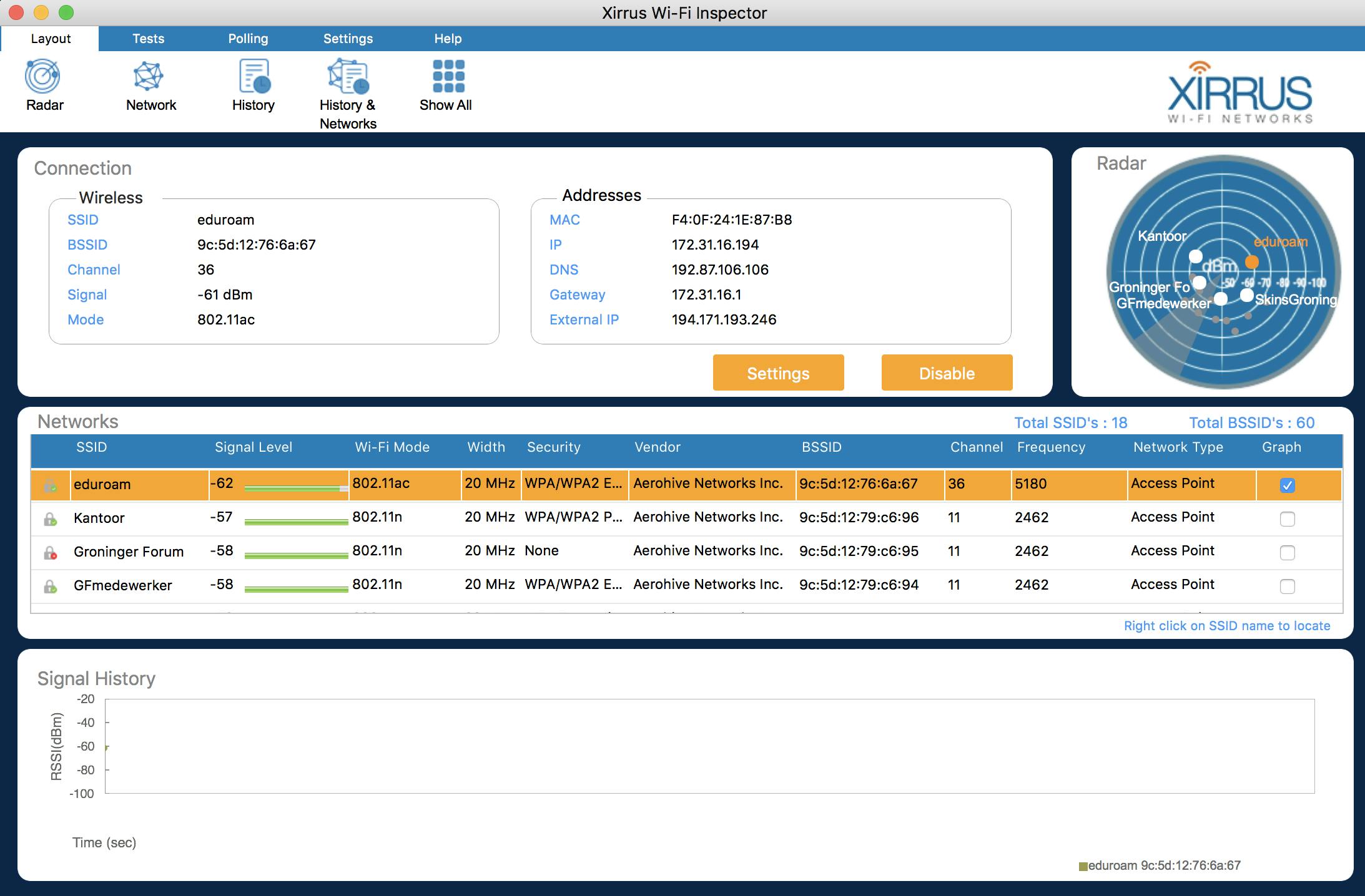 Je kunt de snelste internetverbinding in huis halen, maar als je wifi-dekking niet goed is, heb je er weinig aan. De kwaliteit van je draadloze verbinding hangt namelijk niet alleen af van het abonnement dat je hebt, maar ook van de positie van je router, het aantal wifi-signalen in de buurt en bijvoorbeeld de objecten tussen je apparaat en de router. Simpelweg je router installeren is dus niet voldoende om een goede connectie te garanderen. Xirrus, een bekende fabrikant van wifi-producten, heeft een tool gemaakt om je verder te helpen. Wi-Fi Inspector scant alle netwerken in de buurt en vertelt je gedetailleerd waar de signalen vandaan komen, welke beveiliging ze gebruiken en op welke frequentie ze zitten. Dat laatste is van belang voor de snelheid. Als alle routers in de buurt op dezelfde frequentie zitten, kunnen ze elkaar gaan storen. Zorg dus dat je router een andere frequentie gebruikt dan die van de buren. Onder het tabblad Tests vind je enkele links naar sites om de snelheid en kwaliteit van de verbinding te testen. Heb je genoeg informatie verzameld, dan biedt Xirrus ook nog het gratis programma Wi-Fi Designer aan, waarmee je de optimale positie van de router in je woning kunt bepalen.