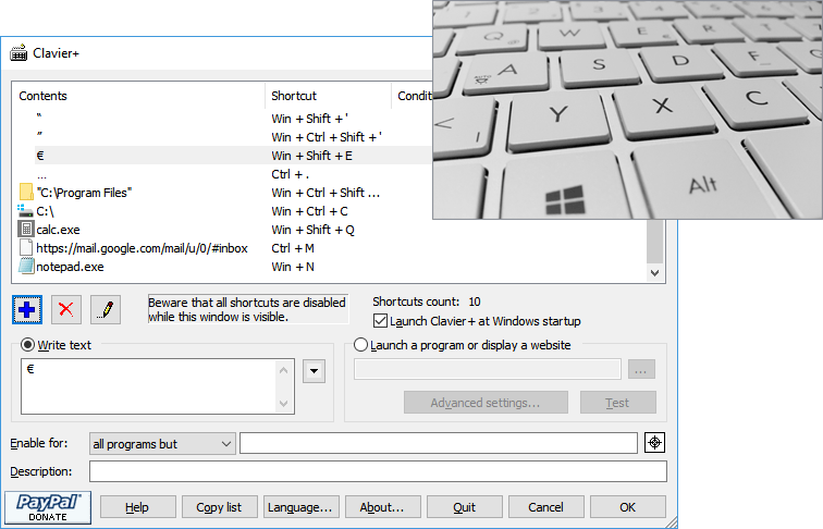 Je kunt de acties die je instelt met Clavier+ overal in Windows gebruiken of koppelen aan een specifiek programma. Standaard heeft Clavier+ al enkele sneltoetsen voor je ingesteld. Zo open je met Windows-toets+N het kladblok en plaats je met Windows-toets+Shift+E het euroteken.